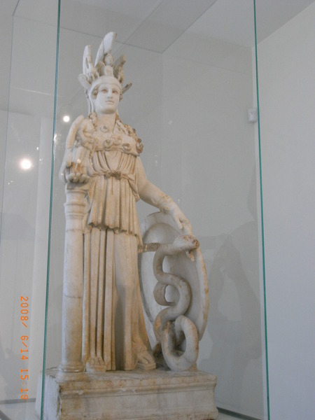 不過更特別的地方在於,這尊雅典娜女神旁邊還伴隨了一條蛇,